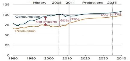 虽然有关美国页岩气开发模式能否在其他国家复制的争论尚未结束,但可以肯定的是,页岩气革命将对美国的能源安全战略产生深远影响。自第一次石油危机以来,早日“实现能源独立”得到了历任美国总统的重视。为了实现这一目标,尼克松、里根、老布什、克林顿、小布什以及奥巴马在入主白宫后均出台过相应的政策。但由图1可以看出,美国的能源自给率在2006年以后才开始上升,而在1980-2005年间却呈现出明显的下降趋势。