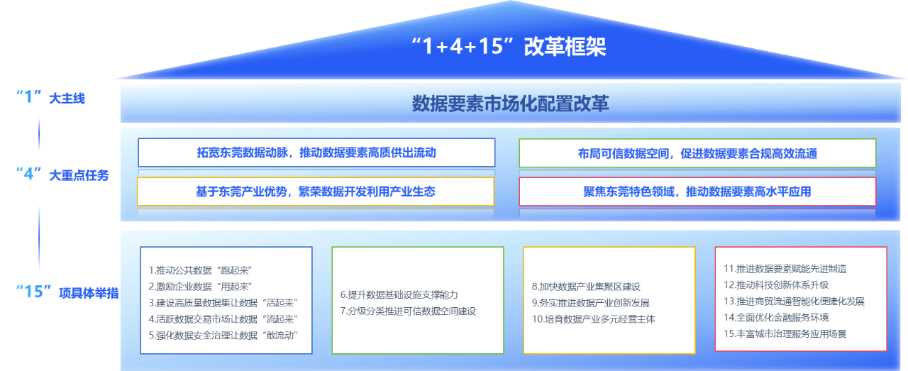 立足东莞市“科技创新+先进制造”城市特色,《行动方案》构建了“1+4+15”的改革框架,部署4大重点任务、15项具体举措。《行动方案》提出,到2027年建成城市可信数据空间和2个以上行业可信数据空间,形成不少于30个行业级高质量数据集,打造10个国家和省级“数据要素×”优秀案例,数据产品服务交易规模突破8亿元。