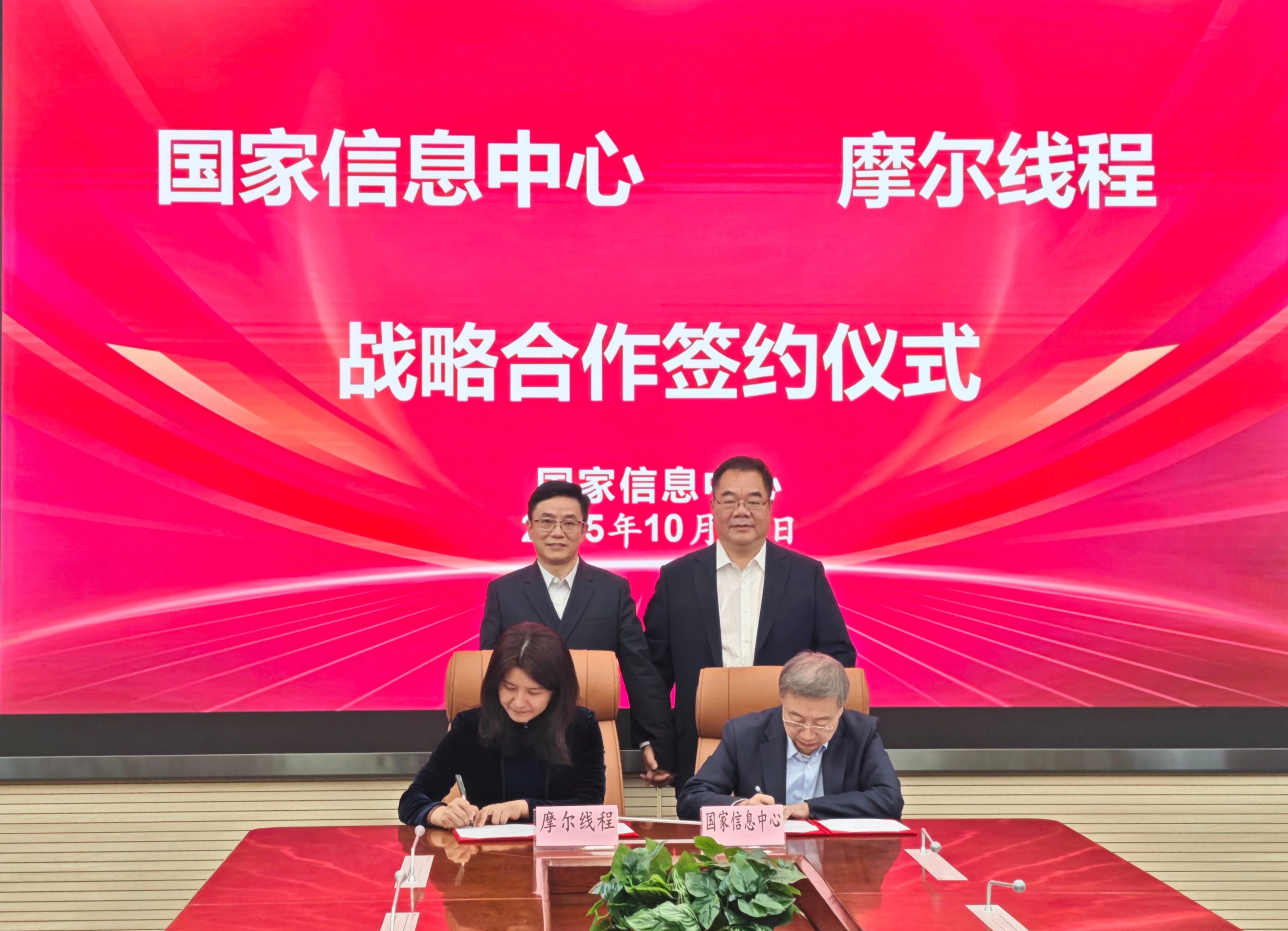 2025年10月21日上午,国家信息中心与摩尔线程智能科技(北京)股份有限公司(以下简称“摩尔线程”)在北京举行战略合作协议签约仪式。国家信息中心主任徐强、摩尔线程智能科技(北京)股份有限公司首席执行官兼创始人张建中出席签约仪式。国家信息中心副主任周民与摩尔线程智能科技(北京)股份有限公司首席运营官周苑代表双方签署战略合作协议。