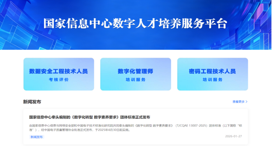近日,国家信息中心“数字人才培养服务平台”(https://pc-ds.wokaoping.com/szrcpyfwpt/home)正式上线。该平台主要服务于人力资源社会保障部数字技术工程师培育项目。人力资源社会保障部于2024年发布《关于公布数字技术工程师培育项目第三批评价机构目录的通知》,国家信息中心获评“数据安全工程技术人员”评价机构,负责全国数据安全(初、中、高级)工程师的考核评价工作;同时也是“数字化管理师”及“密码工程技术人员”两项职业的培训机构。为更好落实相关工作,依据人力资源社会保障部《数字技术工程师培育项目培训机构和评价机构管理办法》要求,建成“数据安全工程技术人员评价服务平台”,该平台集线上考核及考务管理于一体,具备考核信息和学员信息归集、考核成绩报送及证书查询管理等功能,与人力资源社会保障部“工程服务平台专业技术等级证书管理系统”实现技术对接。